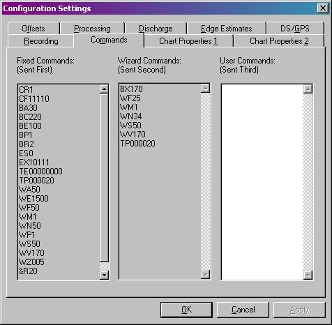 The WinRiver software allows three sets of direct commands to be sent to the ADCP. The set of commands first transmitted to the profiler are called the Fixed Commands and can be viewed in the Commands section of the Configuration Settings menu (figure 1). These commands have been set so that if no other commands were sent to configure the profiler, and the measurements would be acceptable in most flow-measurement situations. They also provide a mechanism for standardizing the basic configuration for both Broadband and Rio Grande ADCP’s. A complete description of the direct commands can be found in the Workhorse Technical Manual (RD Instruments, 2001).