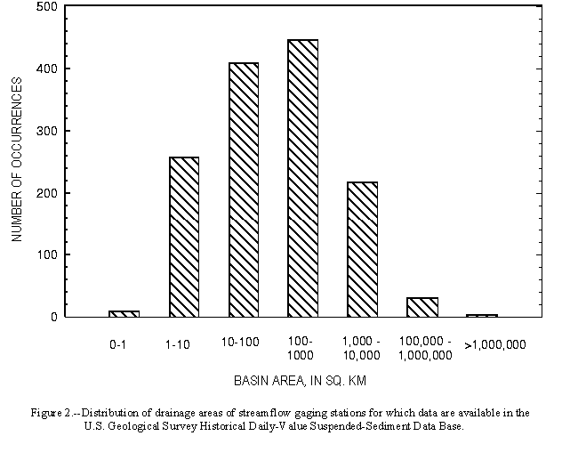 The data base includes 1,593 stations (fig. 1) that have an average period of daily suspended-sediment record of 5.3 years. The period of record for individual stations ranges from 1 day to 44 years, with 13 percent of the stations having a decade or more of daily suspended-sediment record. Drainage areas for these stations range from 0.002 to 1,893,800 square kilometers. The median drainage area for all stations is 767 square kilometers (fig 2).