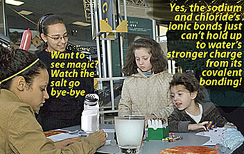 The positively-charged side of the water molecules are attracted to the negatively-charged chloride ions and the negatively-charged side of the water molecules are attracted to the positively-charged sodium ions. Essentially, a tug-of-war ensues with the water molecules winning the match. Water molecules pull the sodium and chloride ions apart, breaking the ionic bond that held them together. After the salt compounds are pulled apart, the sodium and chloride atoms are surrounded by water molecules, as this diagram shows. Once this happens, the salt is dissolved, resulting in a homogeneous solution.