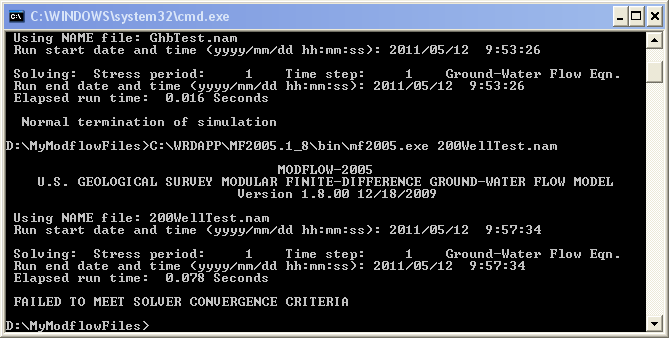 Then you need to change the folder to the one that contains your MODFLOW input files. In this case the folder is D:\MyModflowFiles. Use the "CD" command to change directories.