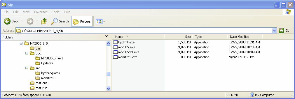 When you unzip the distribution file, MODFLOW and its associated files should be extracted in a subfolder C:\WRDAPP. For MODFLOW-2005 version 1.8, the subfolder is named "MF2005.1_8". The MODFLOW program is located in the "bin" subfolder of the MF2005.1_8 folder as shown below.