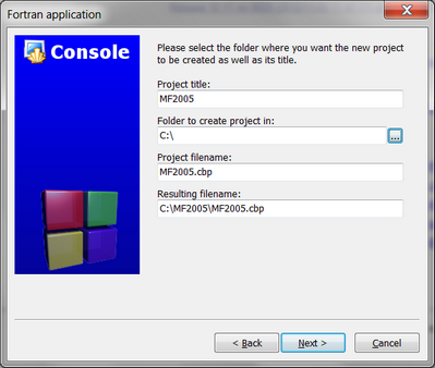 Click Next to the "Welcome to the Fortran Console Application Wizard".