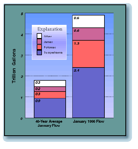 Figure 2. Relation of 46-year average January flow to January 1996 flow into the Chesapeake Bay.